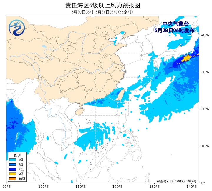 5月27日14時至28日02時,台灣海峽、南海東北部海域出現了5~6級、陣風7級的偏東風或東北風。