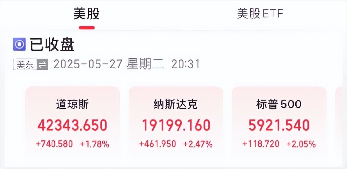 截至收盤,道瓊斯工業平均指數上漲740.58點,收於42,343.65點,漲幅1.78%;標準普爾500指數上漲118.72點,收於5,921.54點,漲幅2.05%;納斯達克綜合指數上漲461.95點,收於19,199.16點,漲幅2.47%。