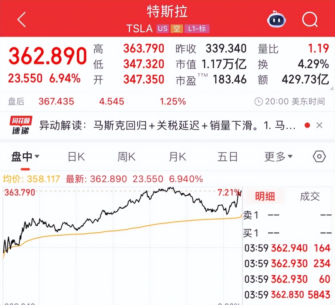 【環球網財經綜合報道】當地時間週二,截至收盤,特斯拉(TSLA)股價上漲6.94%,報收362.89美元,公司市值一夜之間增加759億美元,約合人民幣5461億元。