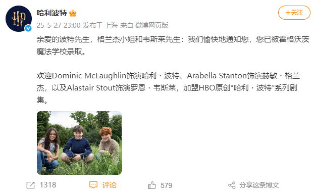 5月27日晚,@哈利波特 發文官宣劇版《哈利波特》三人組演員。