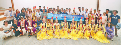 交流營成員走進位於庫車市老城區的龜茲小巷,同當地歌舞演員合影留念。本報記者 蔣雨師攝