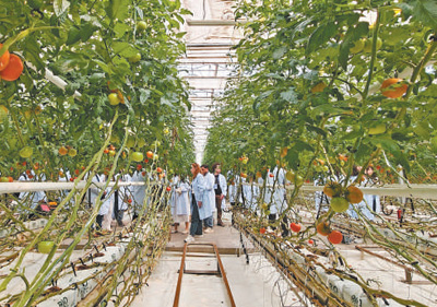 走進新疆高新植物工廠科技開發股份有限公司的生產基地,走道兩側矗立着一排排五六米高的番茄藤架,翠綠粗壯的藤蔓上掛滿了紅彤彤的果實。酸酸甜甜的口感得到交流營成員的一致讚譽。