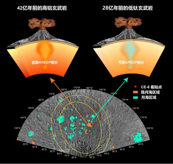 嫦娥六號月球樣品記錄的兩期玄武質火山活動及其月幔源區性質示意圖。(中國科學院供圖)
