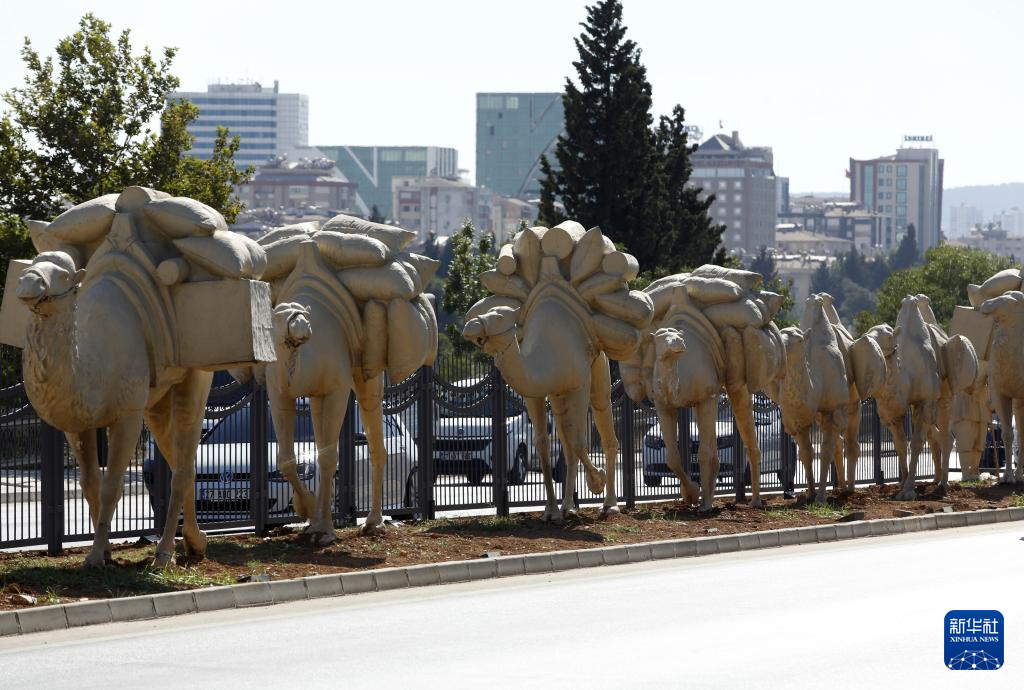 這是5月24日在土耳其加濟安泰普拍攝的古絲綢之路駱駝商隊羣雕。新華社發(穆斯塔法·卡亞攝)