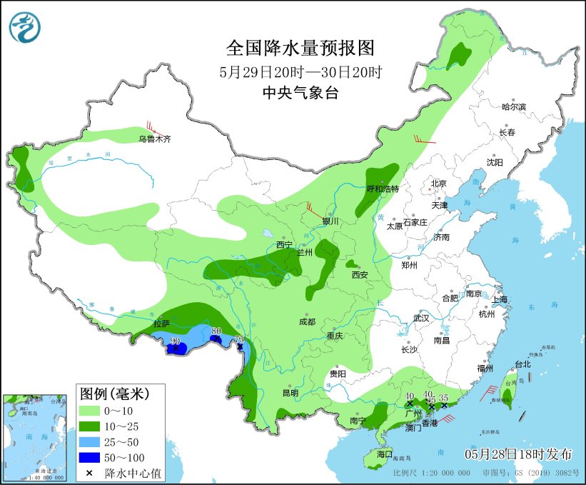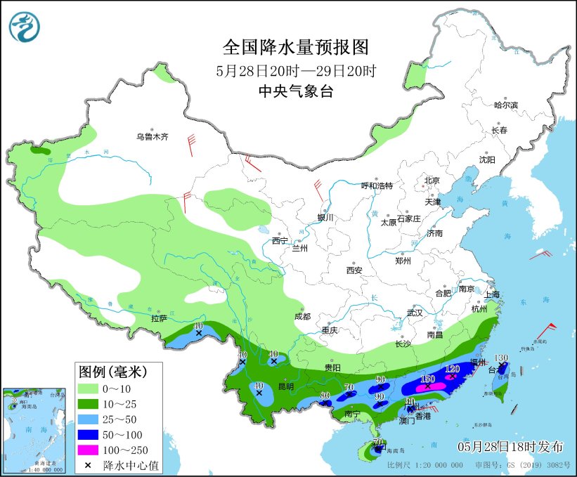 28日夜間至29日,江南東南部、華南大部、西南地區南部等地有大到暴雨,福建南部、廣東北部等地局地有大暴雨,並伴有短時強降水、強對流天氣。預計,5月28日20時至29日20時,福建東部和南部、廣東中北部和南部沿海、廣西中北部和東部、海南島東部、台灣島中北部、雲南西部和北部、四川南部、西藏東南部等地部分地區有大到暴雨,其中,福建南部、廣東中北部、台灣島北部等地局地有大暴雨(100~150毫米)。上述部分地區伴有短時強降水(最大小時降雨量20~40毫米,局地可超過50毫米),局地有雷暴大風等強對流天氣(見圖1)。中央氣象台5月28日18時繼續發佈暴雨黃色預警*。*
