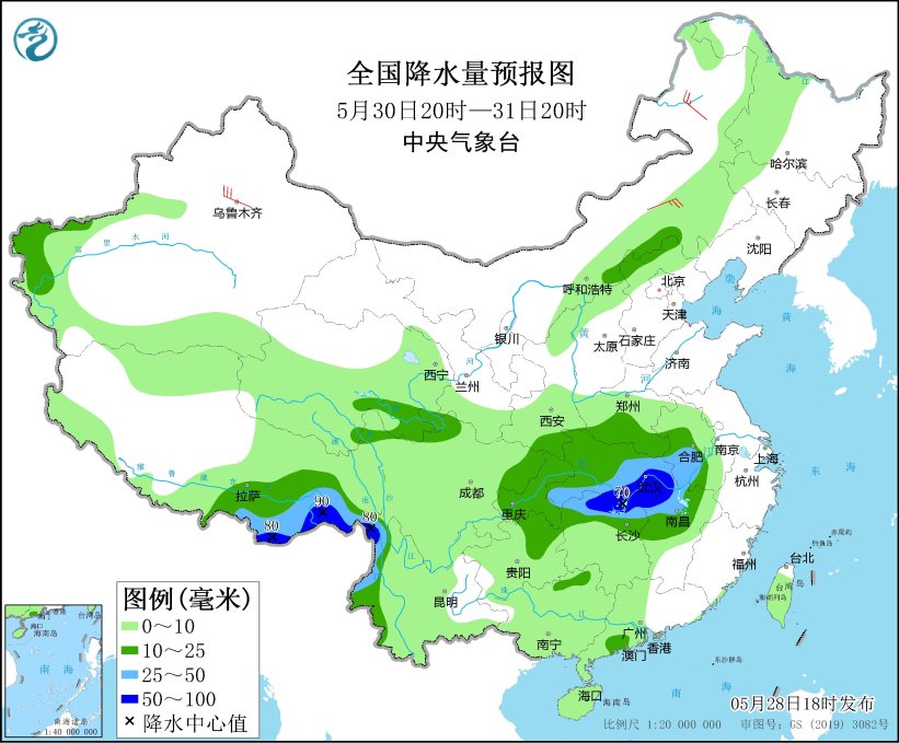 5月31日至6月2日,青藏高原東部及中東部地區將有一次較大範圍降水過程,江漢東部、江淮西南部、江南、華南北部及西藏東南部、貴州、雲南東部和西部等地先後有中到大雨,其中湖北東南部、湖南北部、安徽南部、江西北部、浙江中西部及雲南西北部等地部分地區有暴雨、局地大暴雨;並伴有局地短時強降水、雷暴大風等強對流天氣。