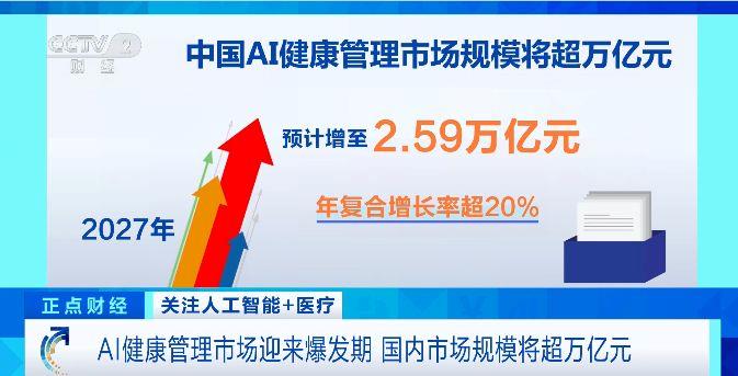 專業機構預計,中國AI健康管理市場規模將超萬億元,2027年預計增至2.59萬億元,年複合增長率超20%。