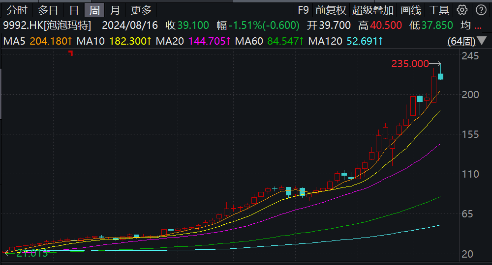 市場層面,今年以來港股“翻倍股”中,新消費主題佔據重要席位,蜜雪冰城、泡泡瑪特、老鋪黃金組成“港股三姐妹”,其中泡泡瑪特總市值一度突破3000億港元,股價從2024年初低點16港元飆升至2025年5月的200港元以上,漲幅超過10倍。