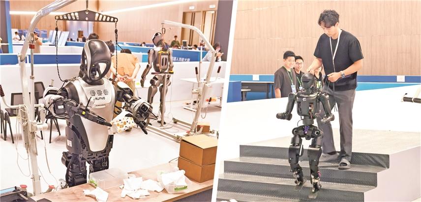 “汽車貼標任務,要求機器人精準識別車身傾斜面並完成貼標籤操作,重點考察標準考驗、視覺定位和柔性操作能力。零部件上下料任務中,我們需要在精度要求下完成孔位對接搬運,強調機械臂的協同與動態穩定性。”張林在接受記者採訪時表示,這兩項任務直擊工業自動化中高精準、高適應性的痛點,也是人形機器人邁向實際應用的關鍵場景。