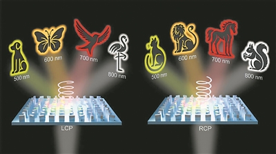 這項技術的一個顯著特點是,它能根據光線的波長(顏色)和自旋(偏振方向)投射出截然不同的圖像。例如,左旋圓偏振紅光可能顯示出一個蘋果的圖像,而右旋圓偏振紅光則可能呈現出一輛汽車的圖像。