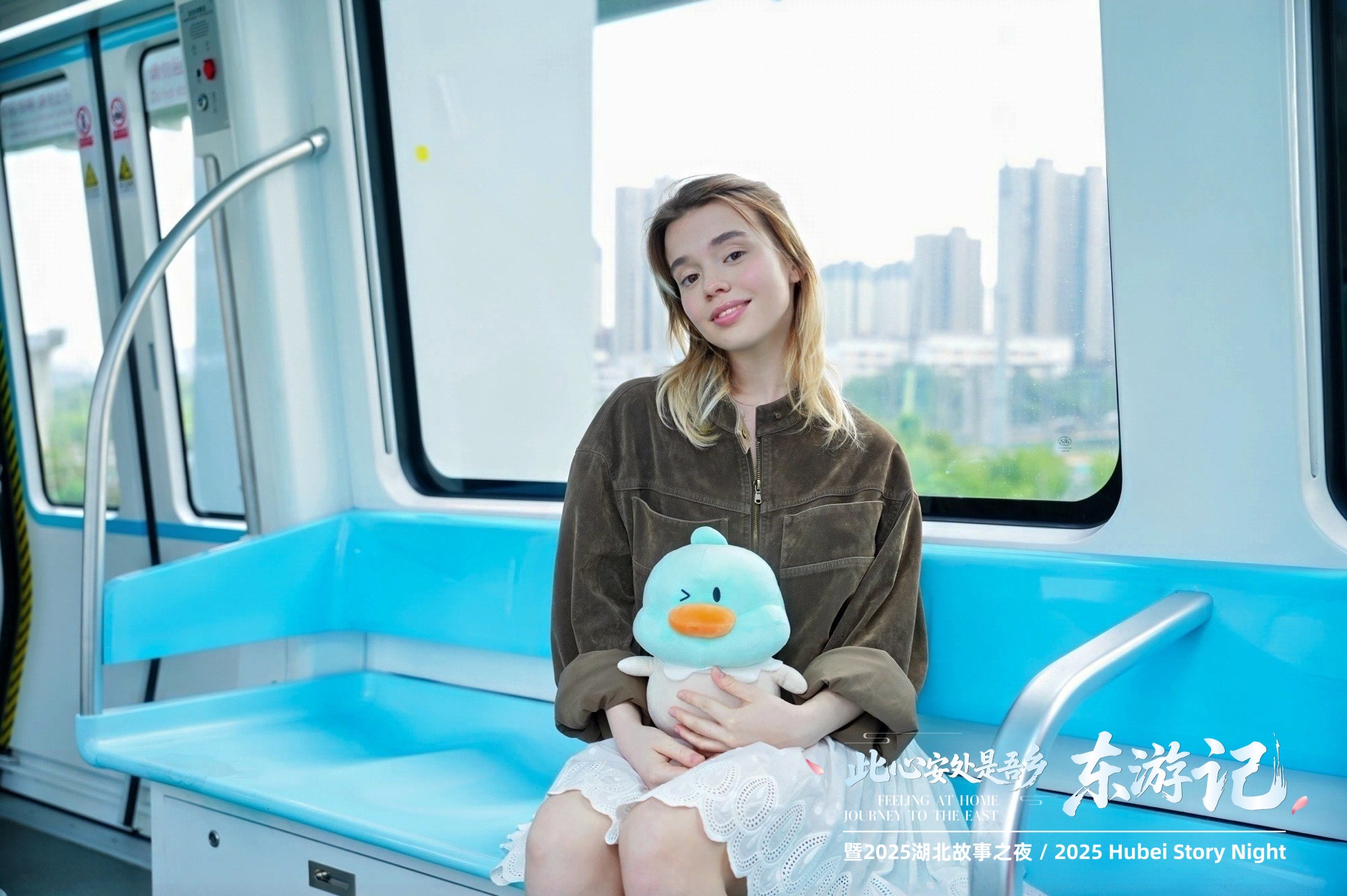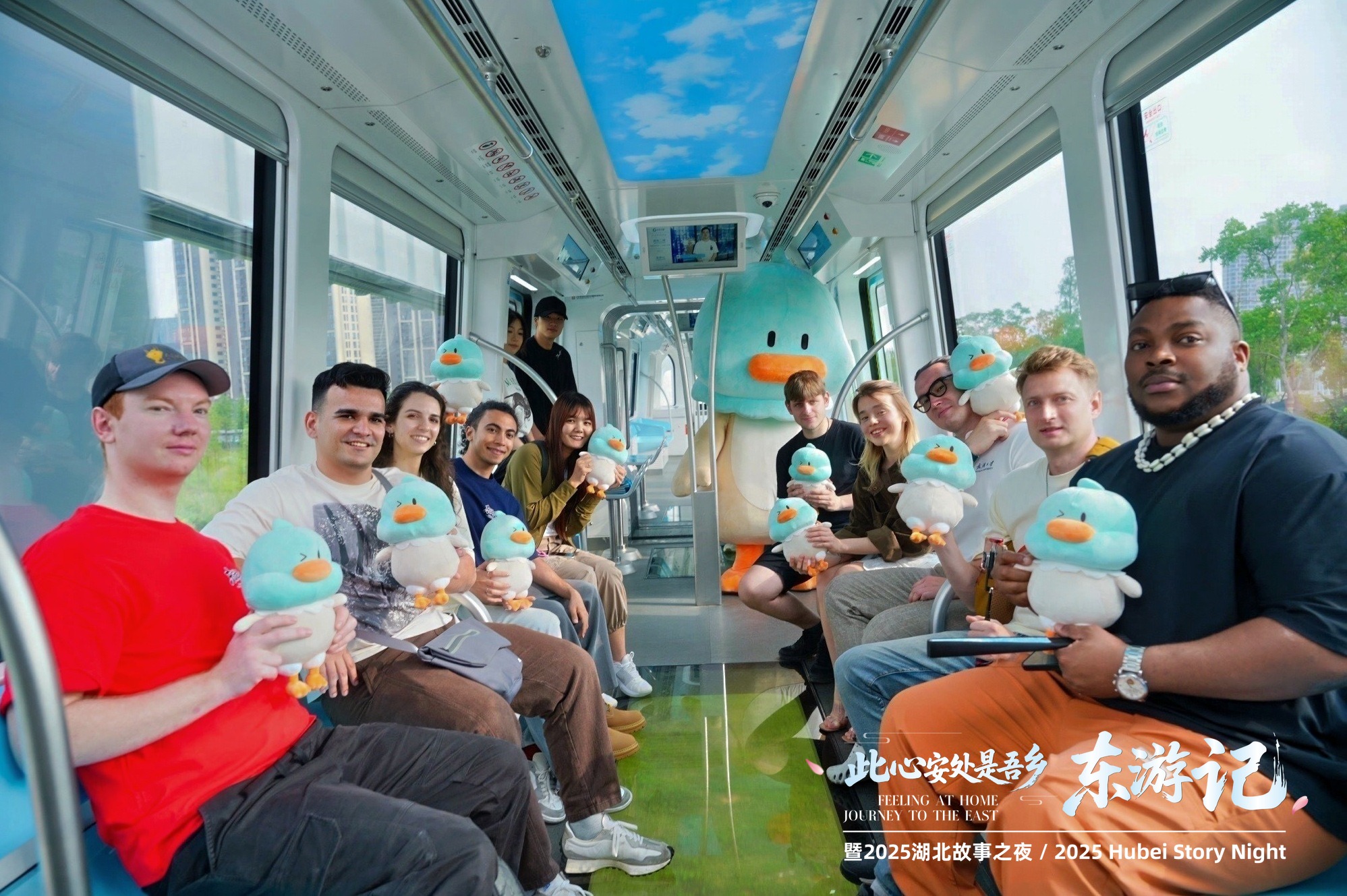 武漢新晉網紅打卡地怎麼少得了光谷空軌,在吉祥物青青鴨的帶領下,體驗官們踏上了空中交通之旅。270°全景視窗將城市天際線變成流動畫卷,無人駕駛系統在空中穿行如科幻大片。這種新奇的乘車體驗引得大家連連讚歎,俄羅斯留學生可欣興奮的説,“我感覺自己飛起來了,像鳥一樣飄在空中。”