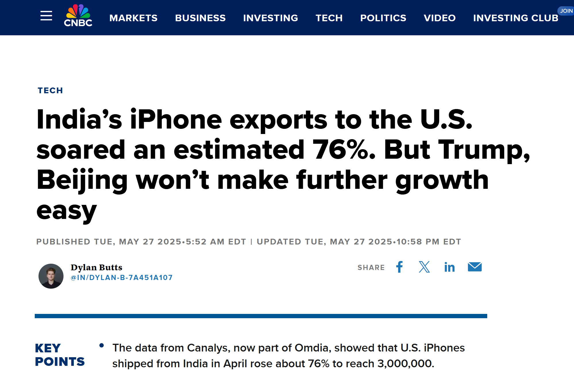 數據顯示,4月份從印度出口到美國的iPhone數量約為300萬部,同比增長76%,但低於3月份的440萬部。這一情況表明,蘋果可能在3月份提前從印度備貨,以應對相關關税政策。今年前四個月,蘋果從印度向美國出口的iPhone數量達到1150萬部。