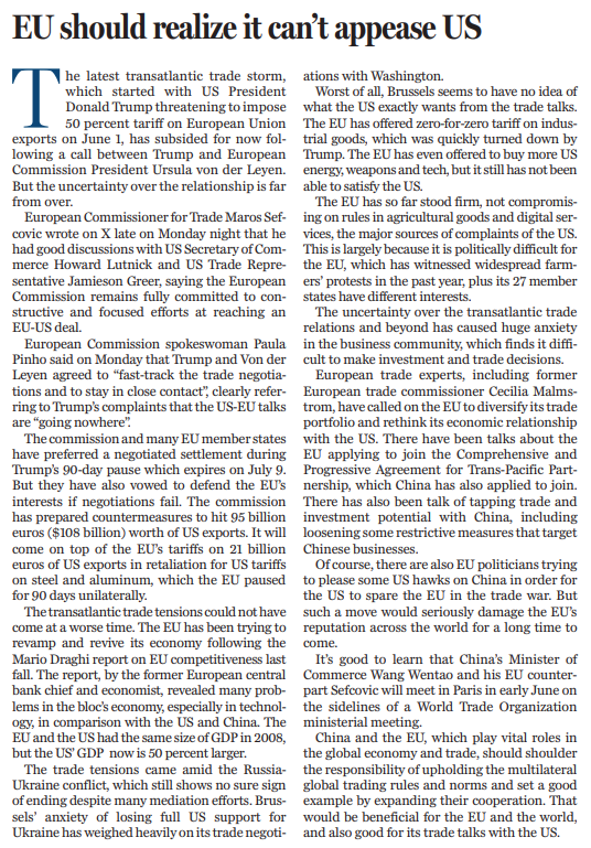 美國與歐盟之間再起貿易風波。近日,美國總統特朗普威脅稱,自6月1日起將對歐盟商品徵收50%的關税。隨後,歐盟委員會主席馮德萊恩與美國總統進行了通話,雙方雖然有所緩和,但歐美關係走向仍面臨諸多不確定性。