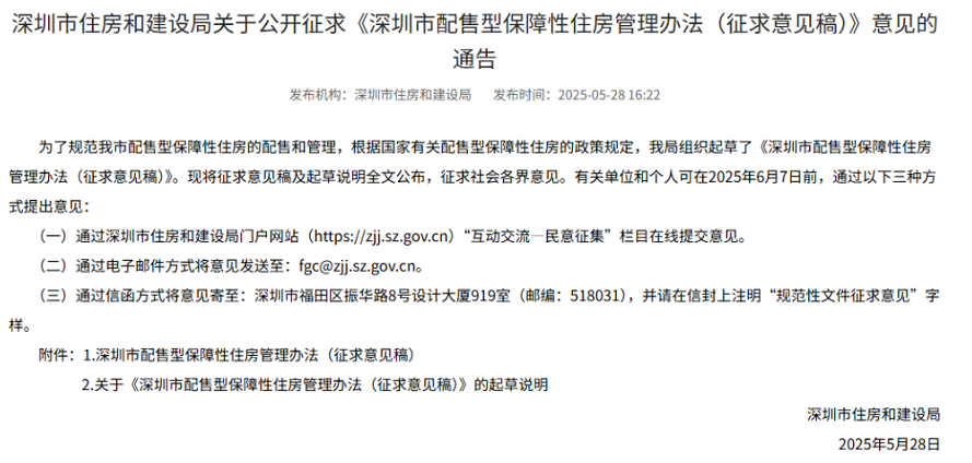 【環球網財經綜合報道】深圳樓市迎來重磅消息!5月28日,深圳市住房和建設局網站發佈了《深圳市配售型保障性住房管理辦法(徵求意見稿)》及《深圳市保障性住房規劃建設管理辦法(修訂徵求意見稿)》,標誌着深圳住房保障體系進一步完善,也將對深圳樓市產生深遠影響。
