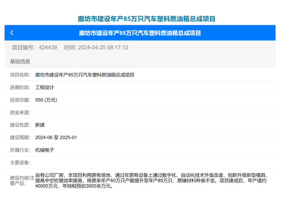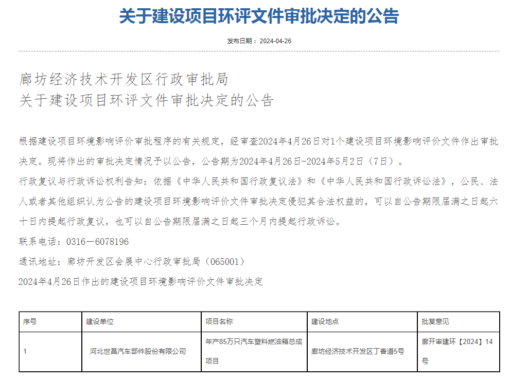 另外,公開信息顯示,2024年世昌股份年產85萬隻汽車塑料燃油箱總成項目獲得批文,項目總投資550萬元,建設地點為廊坊經濟技術開發區丁香道5號,計劃2025年1月建成,建成投產後年產值預計可達4億元。然而,招股書對此項目卻未作任何介紹,這一信息披露的缺失引發了市場的廣泛關注。