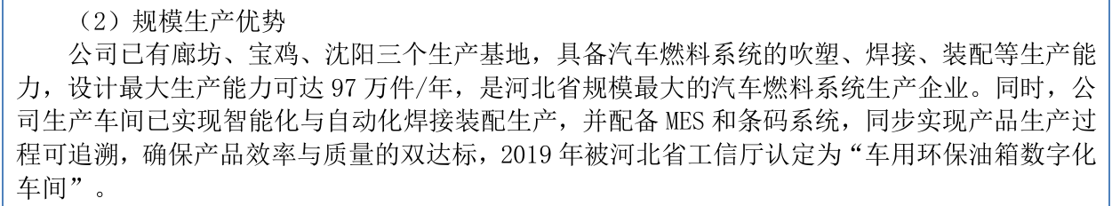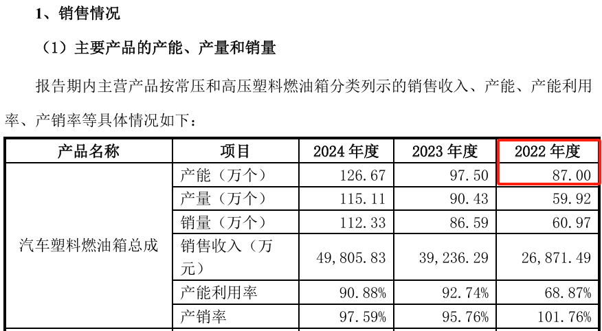 世昌股份此前曾在新三板掛牌上市。其2022年《公開轉讓説明書》中明確披露,公司已有廊坊、寶雞、瀋陽三個生產基地,具備汽車燃料系統的吹塑、焊接、裝配等生產能力,設計最大生產能力可達97萬件/年,是河北省規模最大的汽車燃料系統生產企業。然而,此次北交所上市披露的招股説明書卻顯示,2022年公司汽車塑料燃油箱總成產能僅為87萬件/年,兩者相差10萬件/年,差異幅度達10.31%。