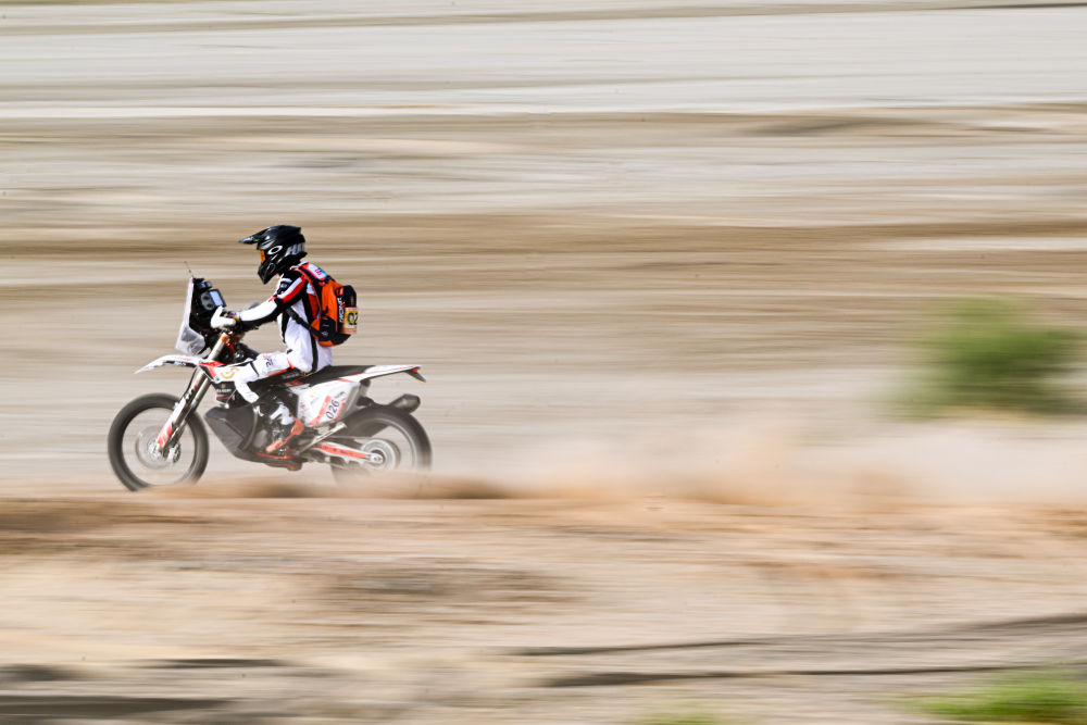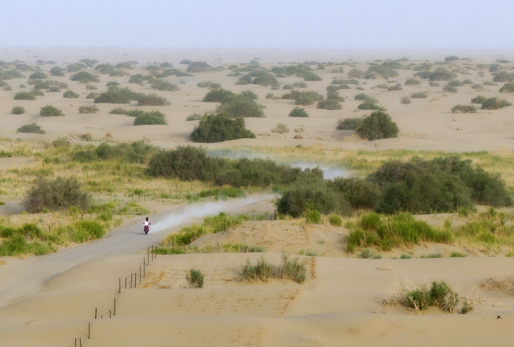 2025年5月26日,摩托車行駛在賽道上(無人機照片)。當日,2025中國環塔國際拉力賽進入第五賽段。該賽段全長280多公里,起點設於和田地區洛浦縣,終點位於墨玉縣。新華社記者 胡星宇 攝
