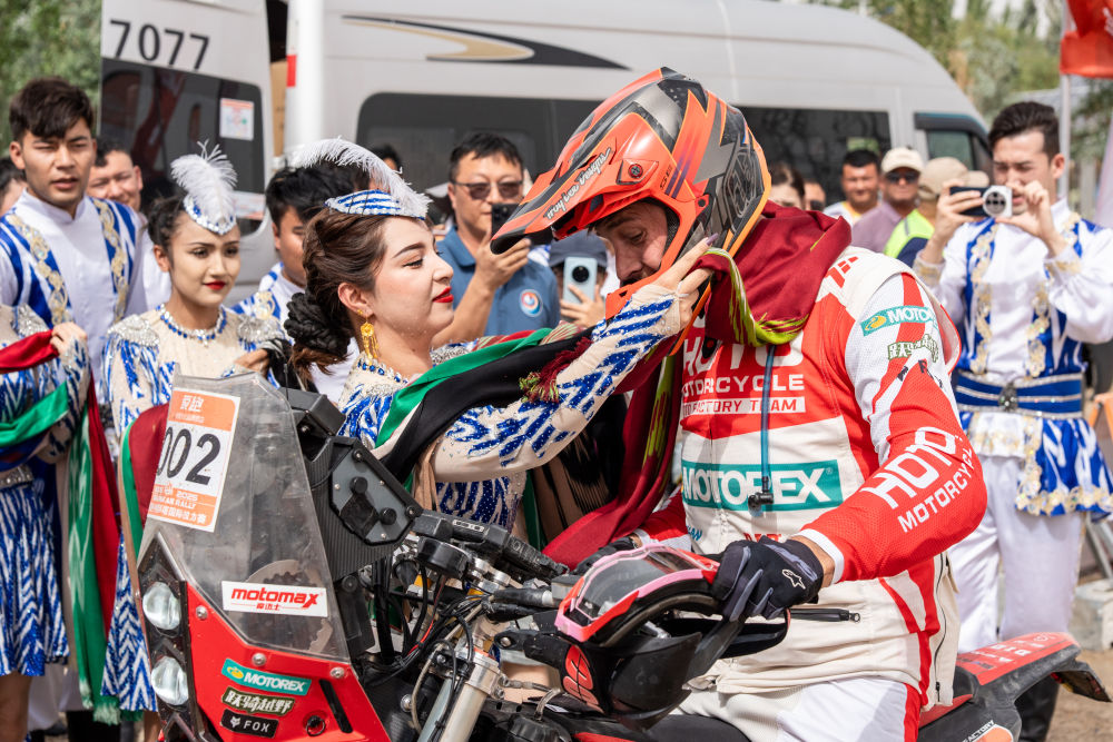 2025年5月24日,在新疆和田地區洛浦縣,舞蹈演員為抵達終點的立陶宛車手阿魯納斯送上艾德萊斯絲巾。新華社發(環塔組委會供圖)