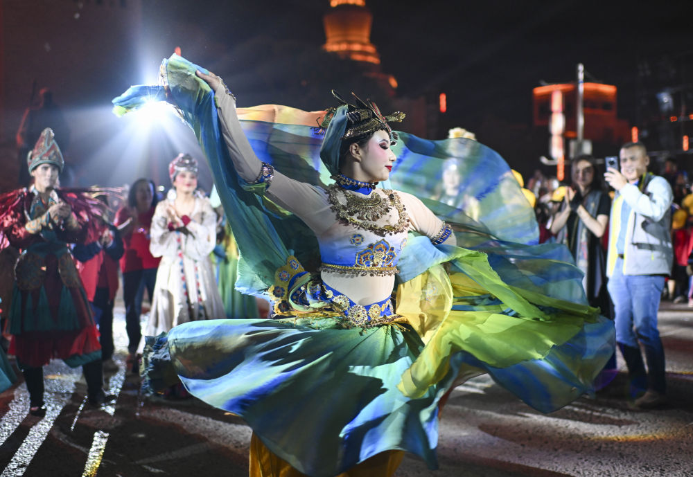 和田市文工團的演員在新疆和田夜市上演出(2025年4月15日攝)。新華社記者 胡虎虎 攝