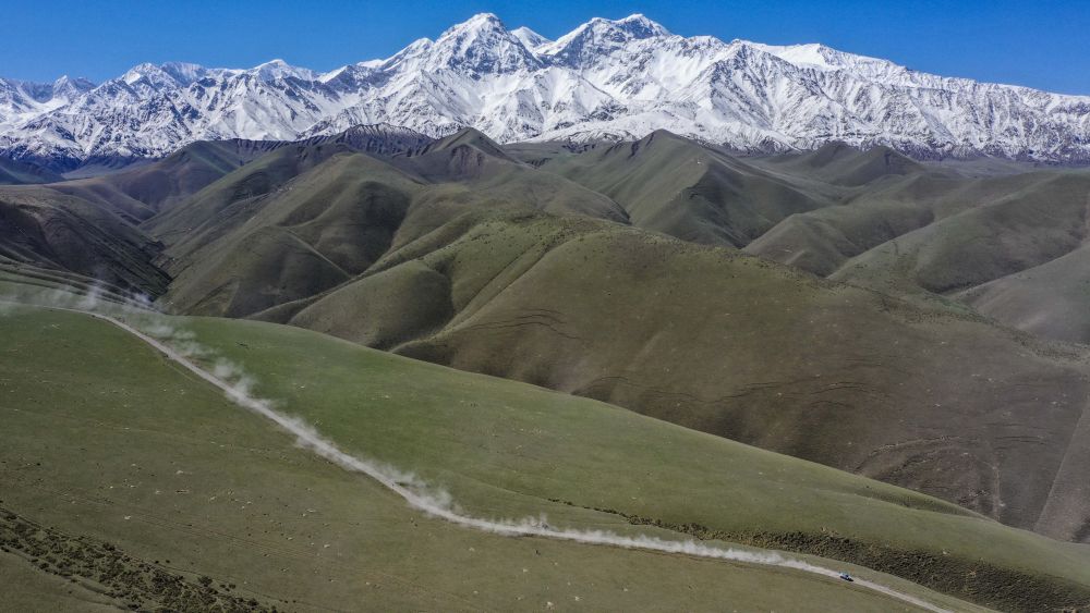 2019年5月31日,在新疆和田地區策勒縣崑崙山區,一輛環塔賽車疾馳在賽道上,遠處的崑崙雪山清晰可見(無人機拍攝)。新華社記者 胡虎虎 攝