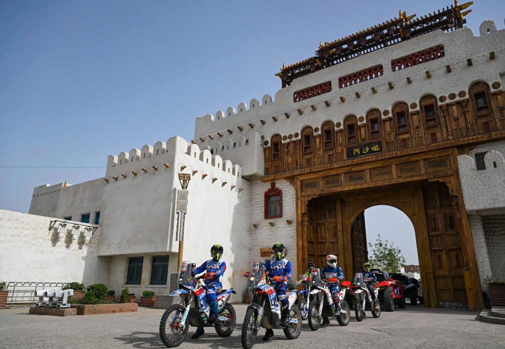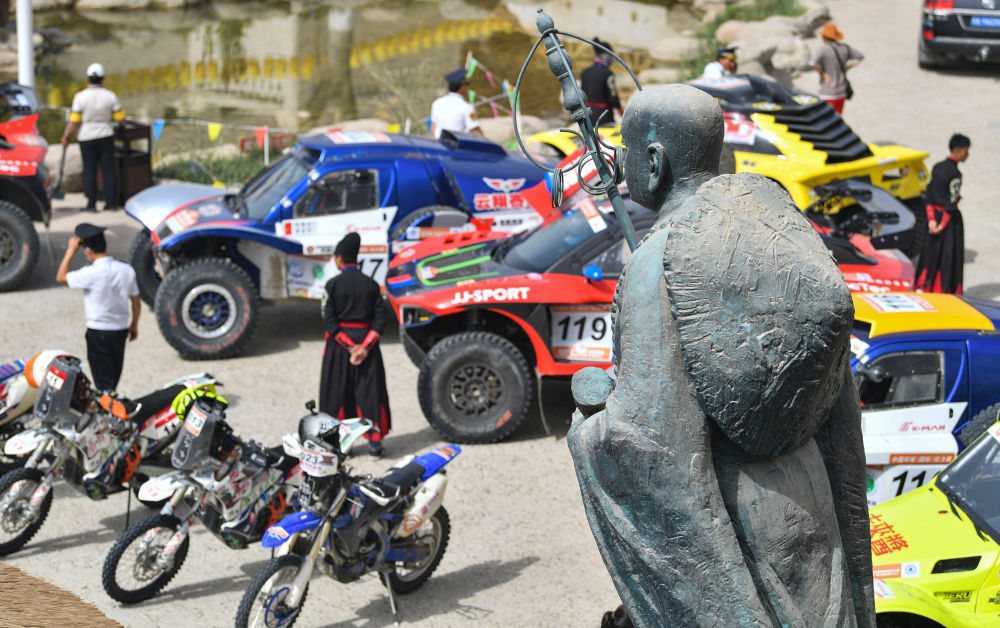 2023年6月1日,2023年環塔拉力賽部分參賽車輛停靠在新疆和田地區約特幹故城景區玄奘廣場,供遊客參觀。新華社記者 胡虎虎 攝