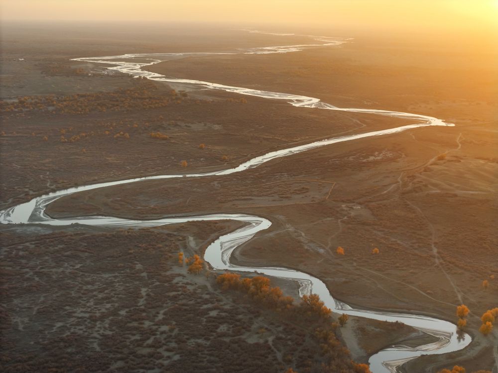 位於新疆和田地區的克里雅河蜿蜒流淌在塔克拉瑪干沙漠深處(2024年11月5日攝,無人機照片)。新華社記者 胡虎虎 攝