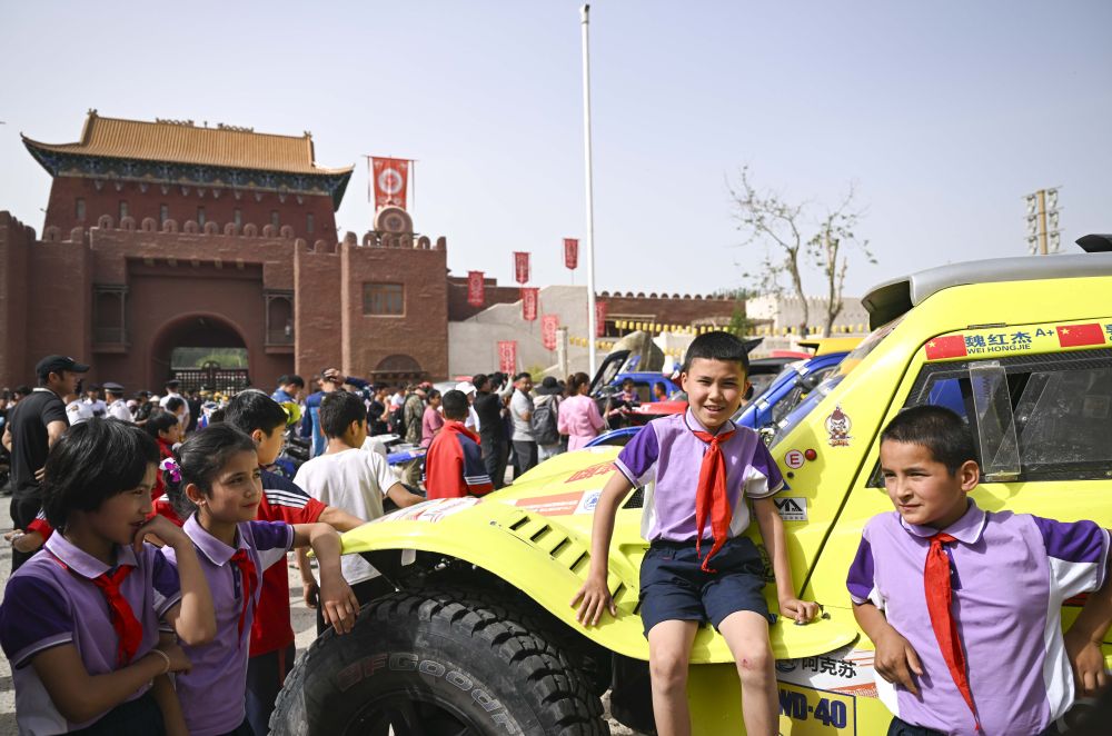 2023年6月1日,和田縣巴格其鎮第一中心小學學生在約特幹故城景區參觀賽車。新華社記者 胡虎虎 攝