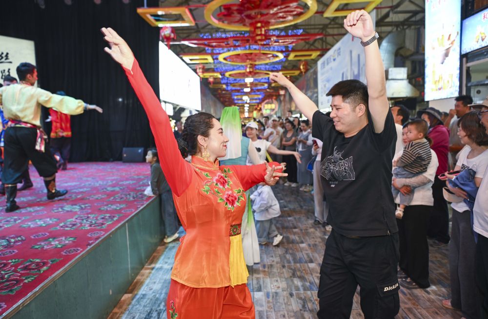 和田市文工團演員努爾比耶·居熱艾提(左)在新疆和田夜市上和遊客一起跳舞(2025年4月16日攝)。新華社記者 胡虎虎 攝