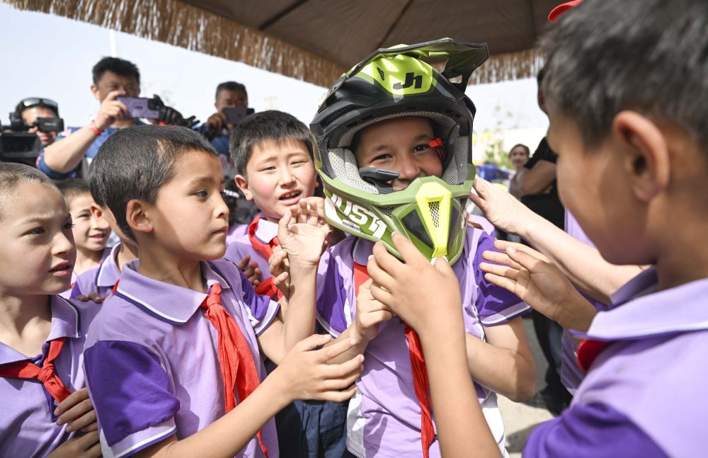 2023年6月1日,新疆和田地區的小學生參加環塔體驗活動時,試戴賽手的頭盔。新華社記者 胡虎虎 攝