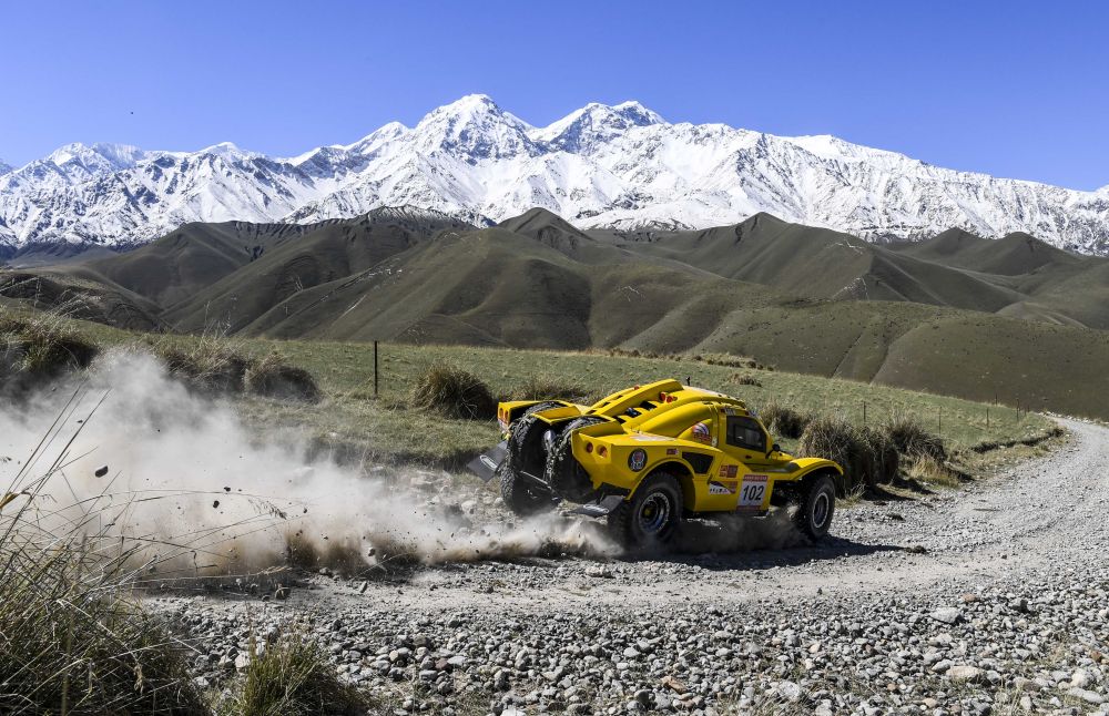 2019年5月31日,在新疆和田地區策勒縣崑崙山區,陝西雲翔汽摩運動有限公司車隊車手訾雲剛、領航員王曾嶸駕駛賽車在比賽中過彎。新華社記者 胡虎虎 攝