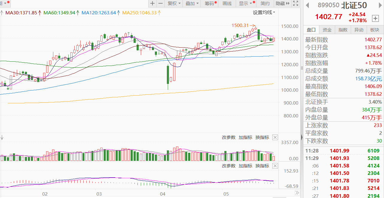 2025年以來,北交所延續了強勁的上升勢頭,整體行情穩步走高。截至5月28日,北證50指數年內累計漲幅達到34.67%,持續領跑全市場。進入5月,北證50漲勢未歇,月內整體上漲3.54%。
