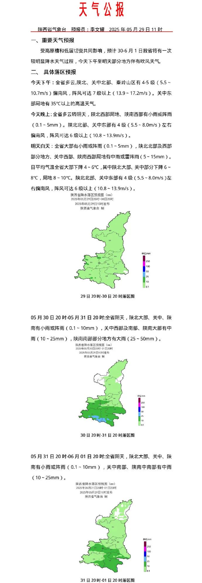 *6月1日:*全省陰天,陝北南部部分地方小雨,關中和陝南有中到大雨。*2日:*全省陰天,陝北大部分地方小雨或陣雨、關中和陝南有小到中雨。3日:全省陰天轉多雲。4日:全省多雲轉晴天。5日:全省晴天間多雲。關中南部局地最高氣温可達35℃。6日:全省多雲間晴天。陝北東部部分地方、關中大部最高氣温可達35~37℃。*7日:*全省多雲間晴天。陝北東部部分地方、關中大部、陝南東部局地最高氣温可達35~37℃。後期天氣趨勢(8-11日):8日我省大部分地方以晴到多雲天氣為主。