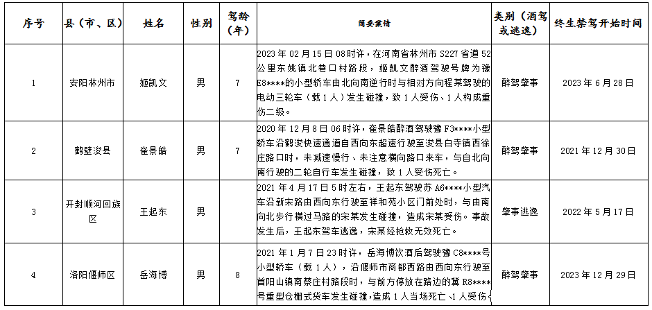 端午假期臨近,羣眾自駕出遊增多。為提高廣大交通參與者交通安全意識,根據近期我省交通安全形勢,河南省公安廳交通管理總隊梳理了近期發生的4起典型事故案例,希望通過案例警示教育廣大機動車駕乘人員,主動抵制酒後駕駛等嚴重違法行為,全力保障人民羣眾生命和財產安全。同時,曝光10名終生禁駕人員、10台違法未處理較多貨運車輛、5家高風險危化品運輸企業、1條隱患突出路段,督促相關企業落實安全生產主體責任,教育企業所屬駕駛人文明守法出行,共同營造安全有序的道路交通環境。