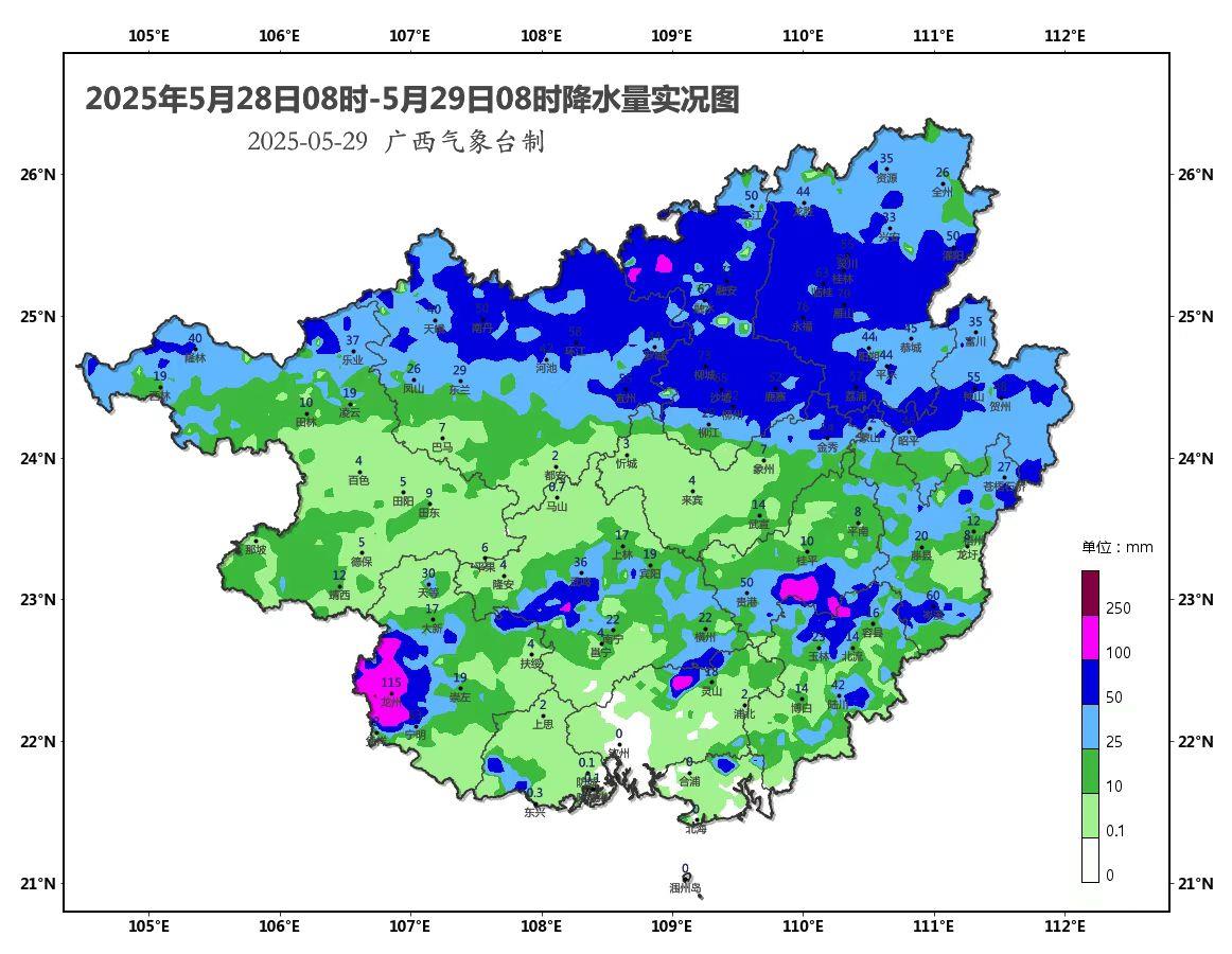 昨天白天到今天早上,桂北有大雨到暴雨、局地大暴雨,桂南部分地區有中到大雨、局地大暴雨到特大暴雨。據統計,5月28日08時至5月29日08時,崇左龍州縣彬橋鄉有特大暴雨(259.8毫米),崇左、欽州、南寧、貴港、玉林、柳州6個市的11個縣(市、區)的28個鄉鎮有大暴雨,14個市的68個縣(市、區)的322個鄉鎮有暴雨,13個市的71個縣(市、區)的307個鄉鎮有大雨,1小時降雨量最大為崇左龍州縣上龍鄉68.8毫米(29日04時)。