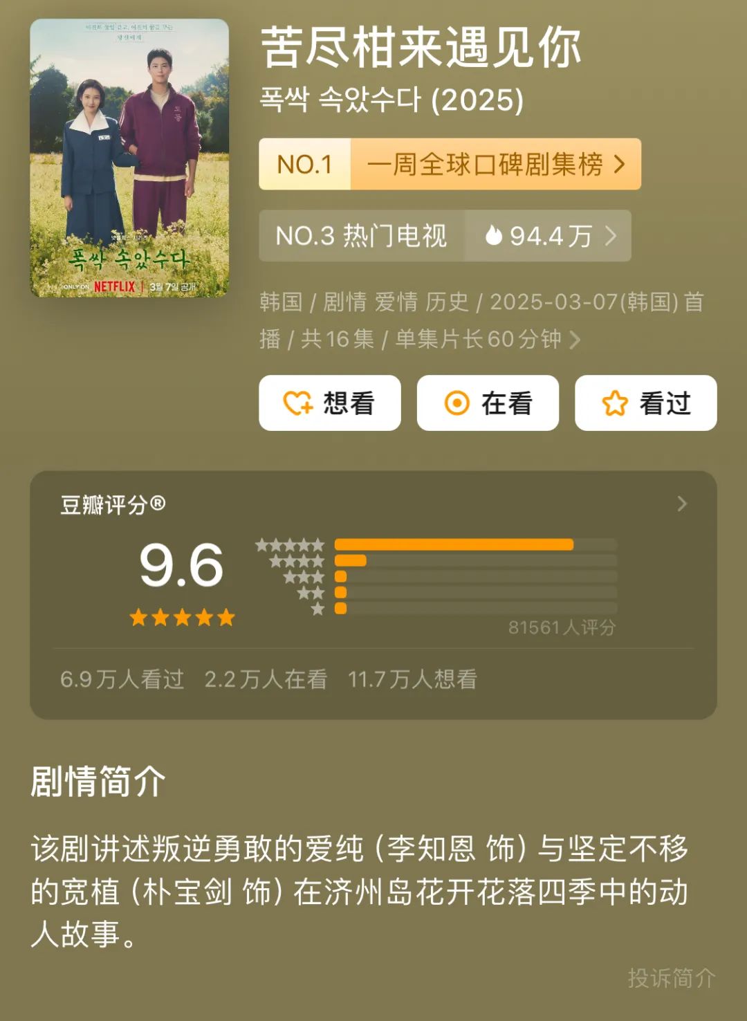 2025年春季,韓劇《苦盡柑來遇見你》首播即登頂Netflix全球熱榜,豆瓣評分更是從開分9.2一路上揚,最終穩定在9.6的高位,成為現象級 “劇王”。