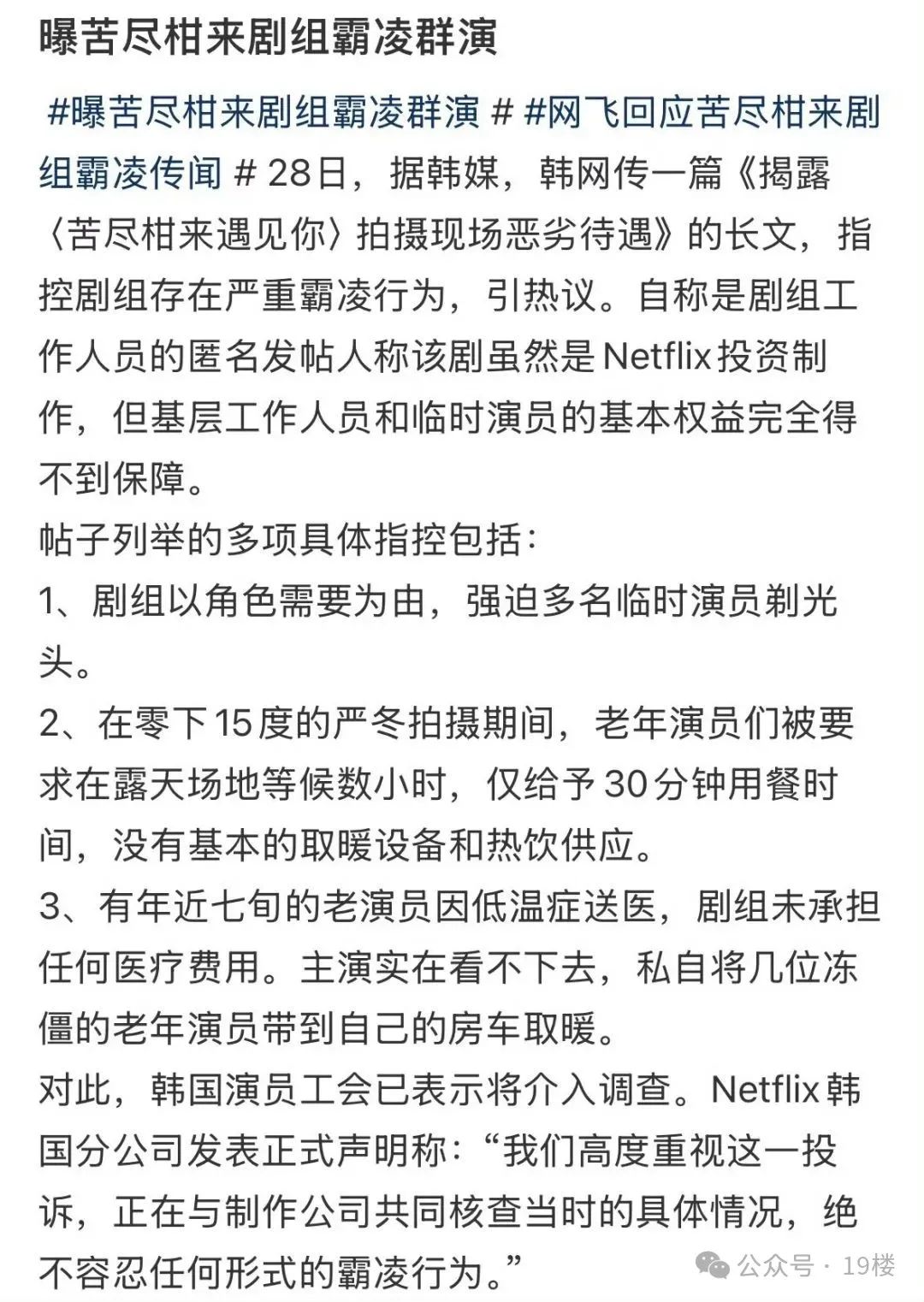 文中詳細揭露:“雖然是Netflix作品,卻完全沒有基本保障。製作組認為‘非主演不值得花錢’,一味專注於成本壓縮”,“在零下15度的嚴冬拍攝期間,老年演員們被要求在露天場地等候數小時,僅給予30分鐘用餐時間,沒有基本的取暖設備和熱飲供應”,還特別指出服裝組連保暖內衣都未發放給臨時演員。