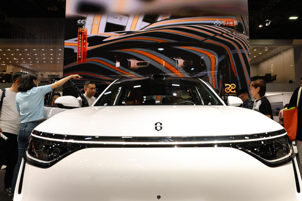 5月1日,參觀者在第二十一屆上海國際汽車工業展覽會上的一輛問界M8展車旁交流。新華社記者 方喆 攝