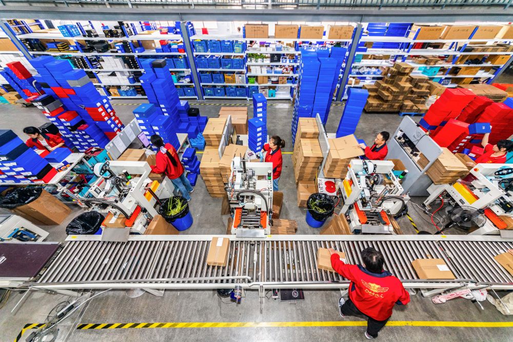 2025年4月20日,在位於浙江省温州市的德賽集團物流園內,工作人員在對發貨鞋類產品進行分揀、打包。新華社發(劉吉利攝)
