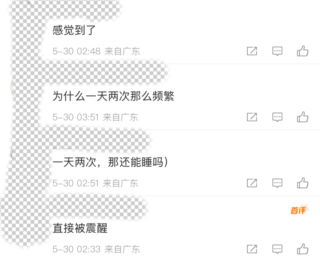 在5月29日13時17分,河源市源城區曾發生3.5級地震。不足24小時連續發生兩次3.0級或以上地震且第二次地震在凌晨發生,讓受影響的人“難眠”。記者在新浪微博“@中國地震台網”評論區看到,有網友留言稱“為什麼一天兩次那麼頻繁”“一天兩次那還能睡嗎”。也有河源市民通過微信羣發出手機收到的地震預警信息截圖,表示凌晨3.0級地震發生時河源有明顯震感。