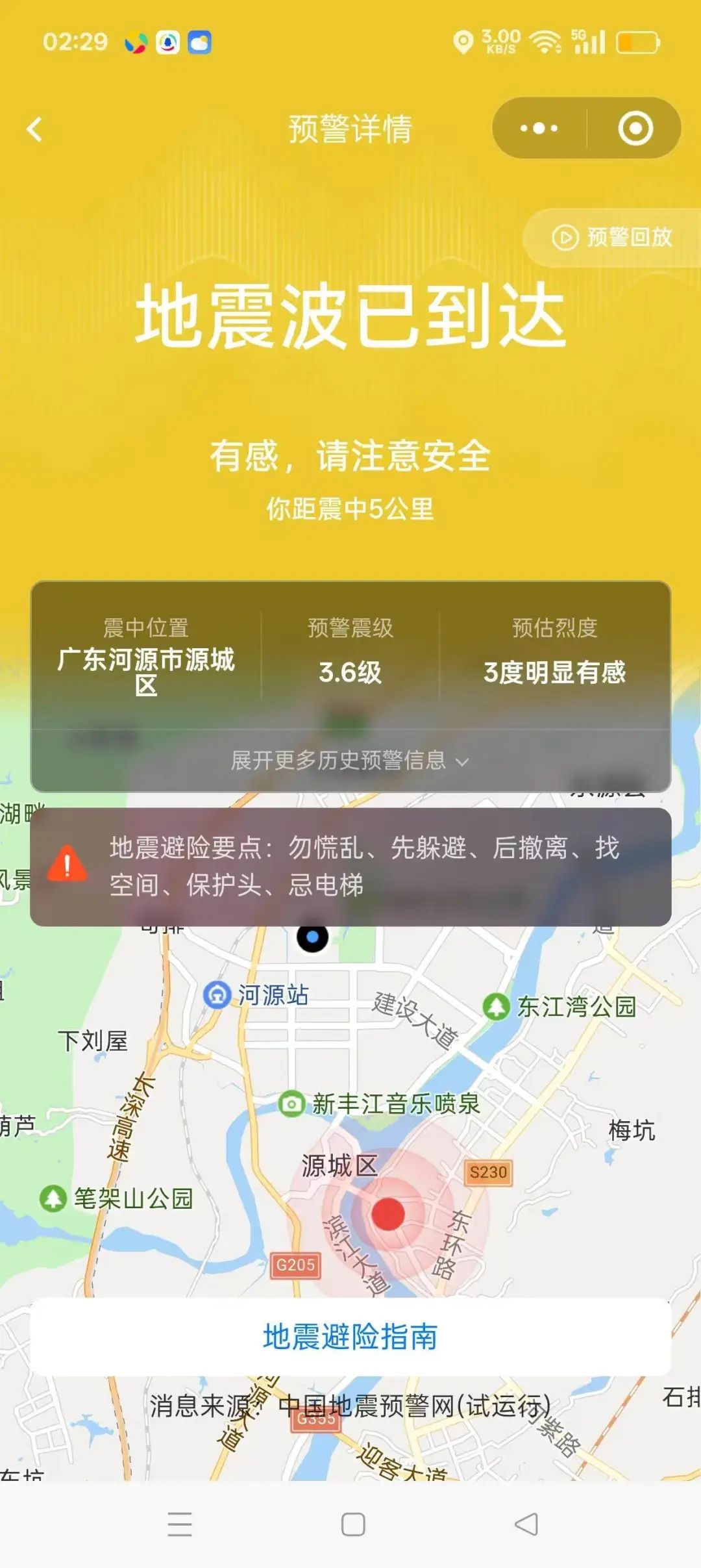 中國地震台網稱,本次河源地震震中5公里範圍內平均海拔約52米。震中周邊200公里內近5年來發生3.0級以上地震共15次,最大地震是2023年3月8日在廣東河源市東源縣發生的4.5級地震(距離本次震中21公里)。