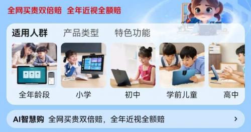 作為京東獨家首創的學習機護眼保障服務,消費者在京東選購帶有“護眼保障”標籤的學習機後,將獲贈365天護眼保障服務,保期長達一年,點擊即可激活。在保障期間內,若被保險人3個月內視力水平降幅達到200度及以上的,可按照學習機的實際支付價格給予消費者提供保險金的賠償。打開京東搜索“買學習機送護眼險”即可選購贈送護眼保障的學習機產品。