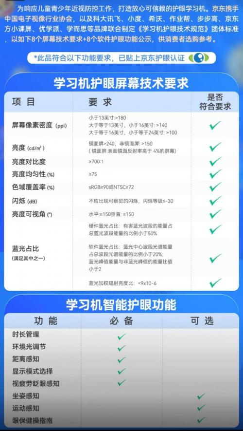 青少年眼部健康問題不容忽視,早在2023年11月,京東就聯合中國電子視像行業協會,以及科大訊飛、學而思、京東方、作業幫、步步高、希沃、優學派、小度等品牌,共同發佈了國內首個《學習機護眼技術規範》團體標準。這一標準針對學習機的屏幕像素密度、屏幕亮度、亮度對比度、色域覆蓋率、屏幕閃爍等級、亮度可視角度以及硬件、軟件的藍光佔比等方面提出了明確的要求,並對學習機智能護眼功能方面進行了強制約束,旨在為消費者提供真正護眼的學習機產品。