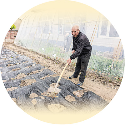 李井文在庭院覆蓋地膜,準備栽種辣椒。