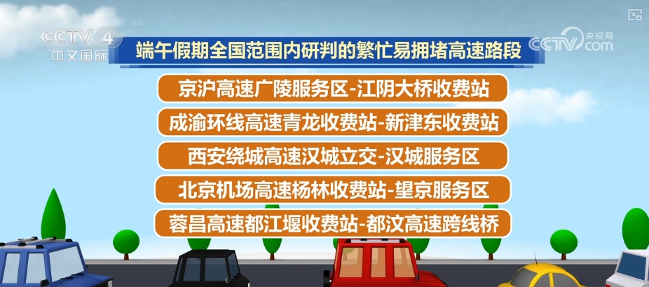 端午假期,全國範圍內研判的繁忙易擁堵高速路段分別為:瀋海高速羅城收費站—廣清收費站、廣澳高速新隆立交—坦尾立交、京滬高速無錫收費站—碩放樞紐、京藏高速西關收費站—八達嶺長城收費站、長張高速迎風橋收費站—益陽服務區、京滬高速廣陵服務區—江陰大橋收費站、成渝環線高速青龍收費站—新津東收費站、西安繞城高速漢城立交—漢城服務區、北京機場高速楊林收費站—望京服務區、蓉昌高速都江堰收費站—都汶高速跨線橋。