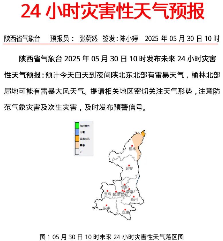 預計今天白天到夜間陝北東北部有雷暴天氣,榆林北部局地可能有雷暴大風天氣。提請相關地區密切關注天氣形勢,注意防範氣象災害及次生災害,及時發佈預警信號。