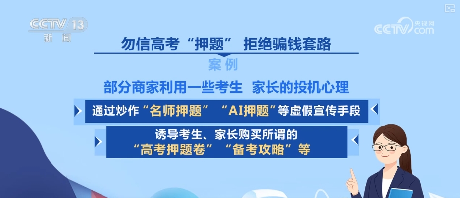 部分商家利用一些考生、家長的投機心理,通過炒作“名師押題”“AI押題”等虛假宣傳手段,誘導考生、家長購買所謂的“高考押題卷”“備考攻略”等。甚至,還有不法分子通過製作釣魚網站,用發短信、網頁彈窗等方式出售所謂的“高考真題和答案”,一旦點擊後就會以“預付訂金”等名義要求付款。