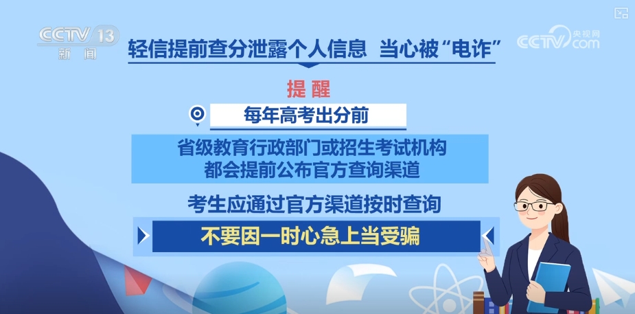 每年高考出分前,省級教育行政部門或招生考試機構都會提前公佈官方查詢渠道,考生應通過官方渠道按時查詢,不要因一時心急上當受騙。