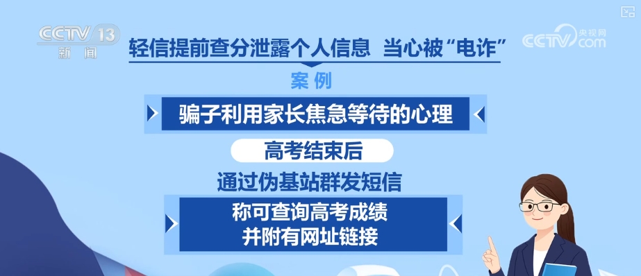 騙子利用家長焦急等待的心理,高考結束後,通過偽基站羣發短信,稱可查詢高考成績,並附有網址鏈接。考生收到此類信息後,點開網址鏈接,導致手機被植入盜取網銀的木馬軟件,或者要求輸入姓名、身份證號、手機號、銀行賬號等信息,被不法分子用於實施電信詐騙。