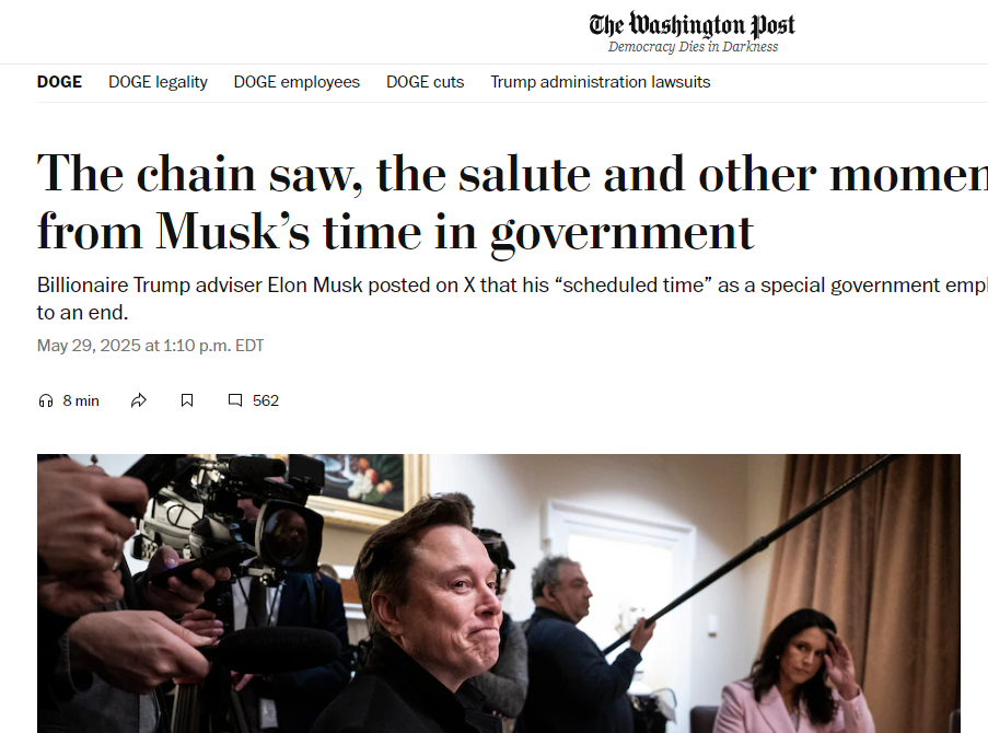 【環球網科技綜合報道】5月30日消息,據華盛頓郵報報道,埃隆·馬斯克在社交媒體上宣佈,他作為特朗普政府特別僱員的任期已經結束。白宮方面也在隨後證實,馬斯克的離任程序正在進行中。