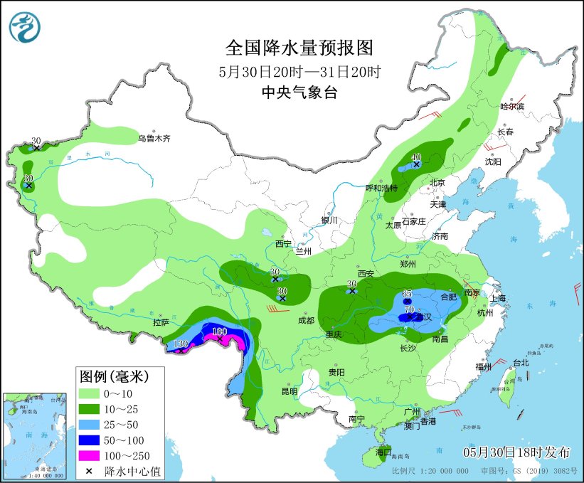 *5月30日20時至31日20時,*內蒙古中東部、山西北部、河北北部、黑龍江西部、新疆南疆西部山區、西藏東南部、雲南西部、青海南部、四川北部、重慶大部、陝西南部、河南南部、湖北大部、湖南北部、江西北部、安徽大部等地部分地區有中到大雨,其中,西藏東南部、雲南西北部、湖南北部、湖北中東部等地部分地區有暴雨或大暴雨(100~180毫米)。內蒙古中部、黑龍江西南部、遼寧北部、江蘇南部等地部分地區有4~6級風,其中,川西高原北部部分地區有6~7級風(見圖1)。